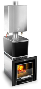 | Новая печь получила опцию встроенного парообразователя. Суть парообразователя в том, что что вода превращается в пар на поверхностях топки из нержавеющей стали, нагретых свыше 500 градусов С°, а не только с камней. Мягкий, сухой, перегретый и исключительно легкий пар, может быть получен с парообразователя сразу после выхода печи на рабочий режим, то есть через 15-20 мин. Имеется возможность непрерывного парообразования при использовании устройств капельной подачи воды в парообразователь.